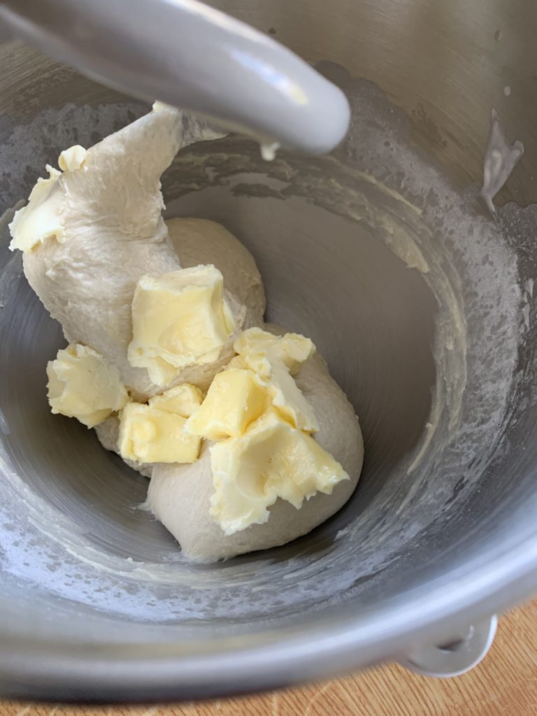 Hněťte asi 10 minut, dokud se těsto pěkně nespojí a nevypracuje částečně lepek. Teprve teď přidejte kostky povoleného másla.