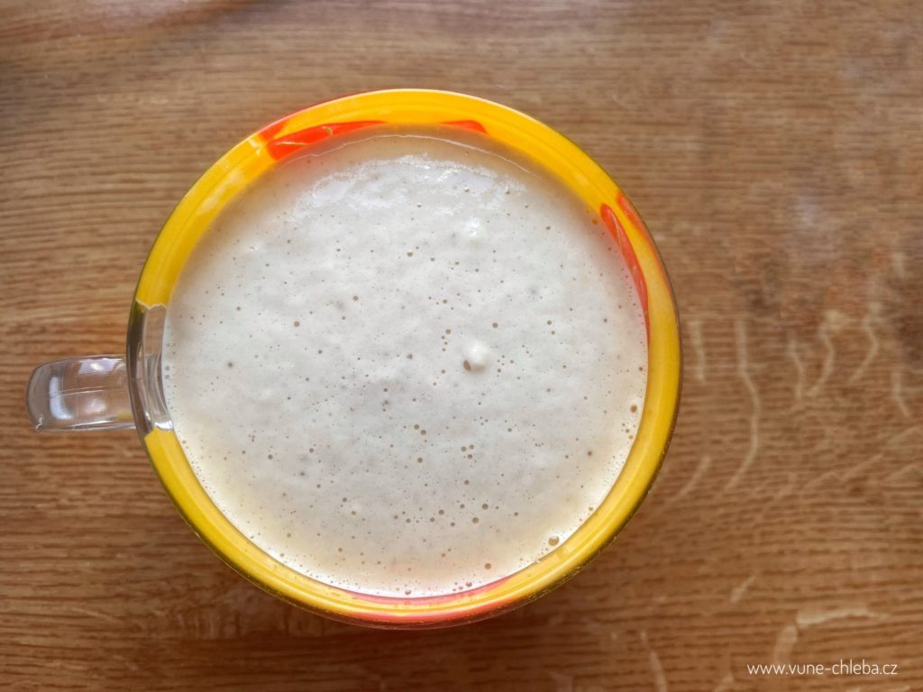 Nejprve si připravte kvásek do těsta. Do hrnku rozdrobte droždí, zalejte ½ množství recepturní vody, rozmíchejte a přidejte vrchovatou lžíci z odvážené mouky. Vše promíchejte a nechte vzejít kvásek cca 20 minut.